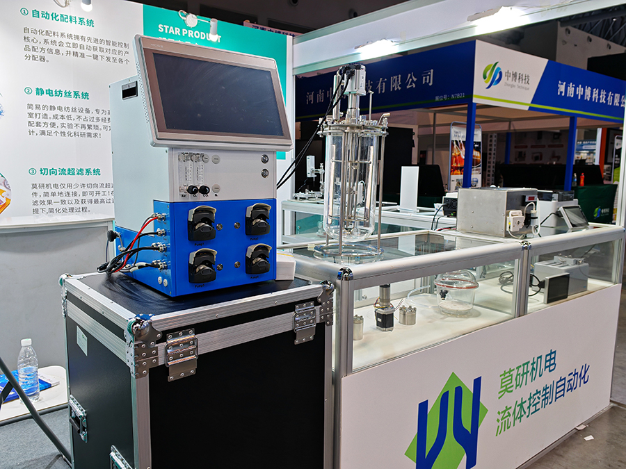展會現(xiàn)場,莫研機(jī)電的展位號為 N7A22,精心陳列了滴定儀、生物發(fā)生器、蠕動泵、注射泵等多款先進(jìn)儀器,以及靜電紡絲系統(tǒng)、切向流系統(tǒng)、稱重分裝系統(tǒng)等系統(tǒng)應(yīng)用。其中,自動化配料系統(tǒng)與生物反應(yīng)器系統(tǒng)堪稱明星展品。自動化配料系統(tǒng)以其先進(jìn)智能控制核心驚艷全場,能迅速獲取產(chǎn)品配方信息,并一鍵下發(fā)至各分配器。FKE - A5 全自動生物反應(yīng)器作為生物反應(yīng)器系統(tǒng)代表,高精度 DO 控制與全自動過程控制能力,為高校實(shí)驗(yàn)及科研工作筑牢堅(jiān)實(shí)技術(shù)支撐,其簡潔界面與自由擴(kuò)展性能,深度契合科研個性化需求,有力推動實(shí)驗(yàn)進(jìn)程。